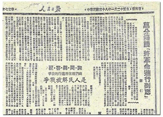 1949年1月25日《人民日报》第4版刊登的文章:万分拥护将革命进行到底