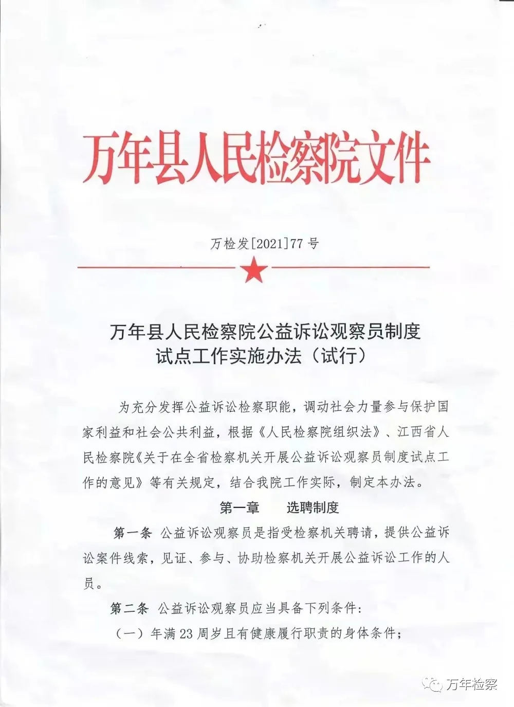 为更好地发挥公益诉讼检察职能,有效调动社会力量参与保护国家利益和社会公共利益,落实政法队伍教育整顿“我为群众办实事”活动部署要求,深入推动党史学习教育和检察队伍教育整顿走深走实。作为省检察院试点院,万年县人民检察院出台《万年县人民检察院公益诉讼观察员制度试点工作实施办法(试行)》,并面向社会选聘了首批8名公益诉讼观察员,包含来自行政单位、律所、新闻媒体等各行各业专业人士。