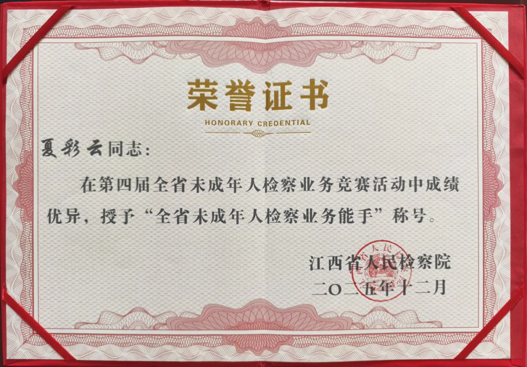 历经业务笔试、以案释法与业务答辩、策论写作、模拟法庭辩论四个环节的激烈比拼,我院第一检察部干警夏彩云斩获佳绩,荣获“全省未成年人检察业务能手”称号!