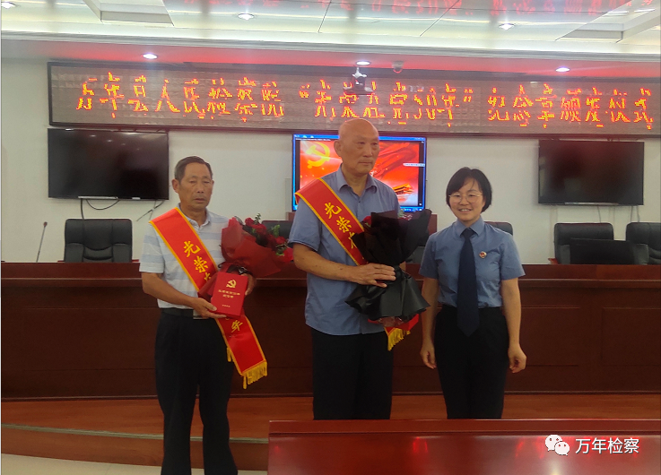 党组成员、副检察长蔡明筱同志为3名在党50年以上的老党员颁发了纪念章,对老党员们几十年来忠诚党的事业、践行检察初心,兢兢业业为党和检察事业工作、踏踏实实为群众服务致以敬意和感谢。“万年检察工作的发展,是一代代检察人拼搏奋斗出来的。每一位老同志都是万年检察的功臣,都是检察院的财富,是所有检察人员的骄傲,是广大青年干警的榜样。”蔡明筱说,我们应该向光荣的老党员看齐,以榜样之光照亮征程、争做先锋,厚植爱党爱国情怀,坚定许党许国信念,勇担兴党兴国使命,书写无愧于党、无愧于时代、无愧于人民的华丽篇章。
