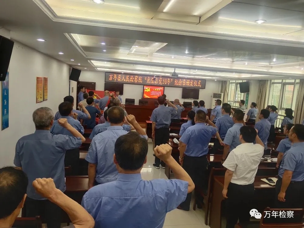 颁奖仪式结束后,全体检察干警在离退休干部党支部书记曹添泰同志的带领下面对党旗,举起右手,重温了入党时对党和人民作出的庄严承诺。
