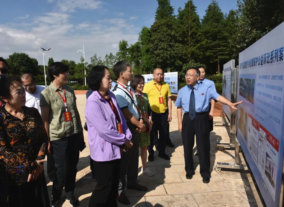 代表来到位于滇池畔的星海半岛湿地,就检察机关发挥公益诉讼职能保护滇池流域生态环境相关工作进行视察。图为检察人员介绍昆明检察机关公益诉讼情况和典型案例。